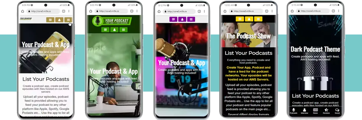 Our pre-made podcast template designs allow you to create your podcast site or app quickly. With just a click you can have a website themed for podcasts instantly. Then simply add your own podcasts into the system, grab the podcast feed and let the popular podcast platforms know your feed url and your done!