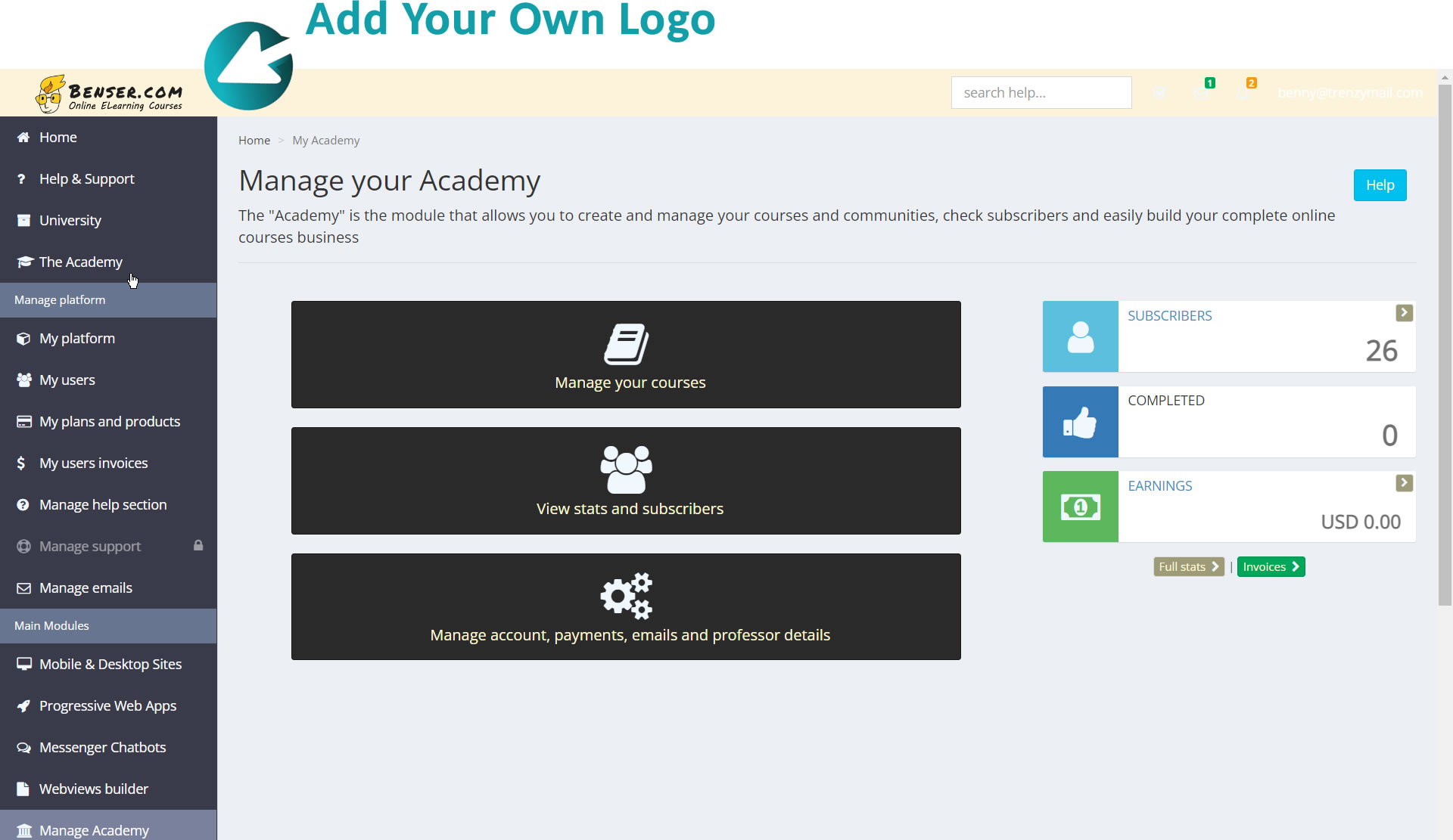 Depending on your plan, you could add your own logo and custom domain to your course website or membership area.