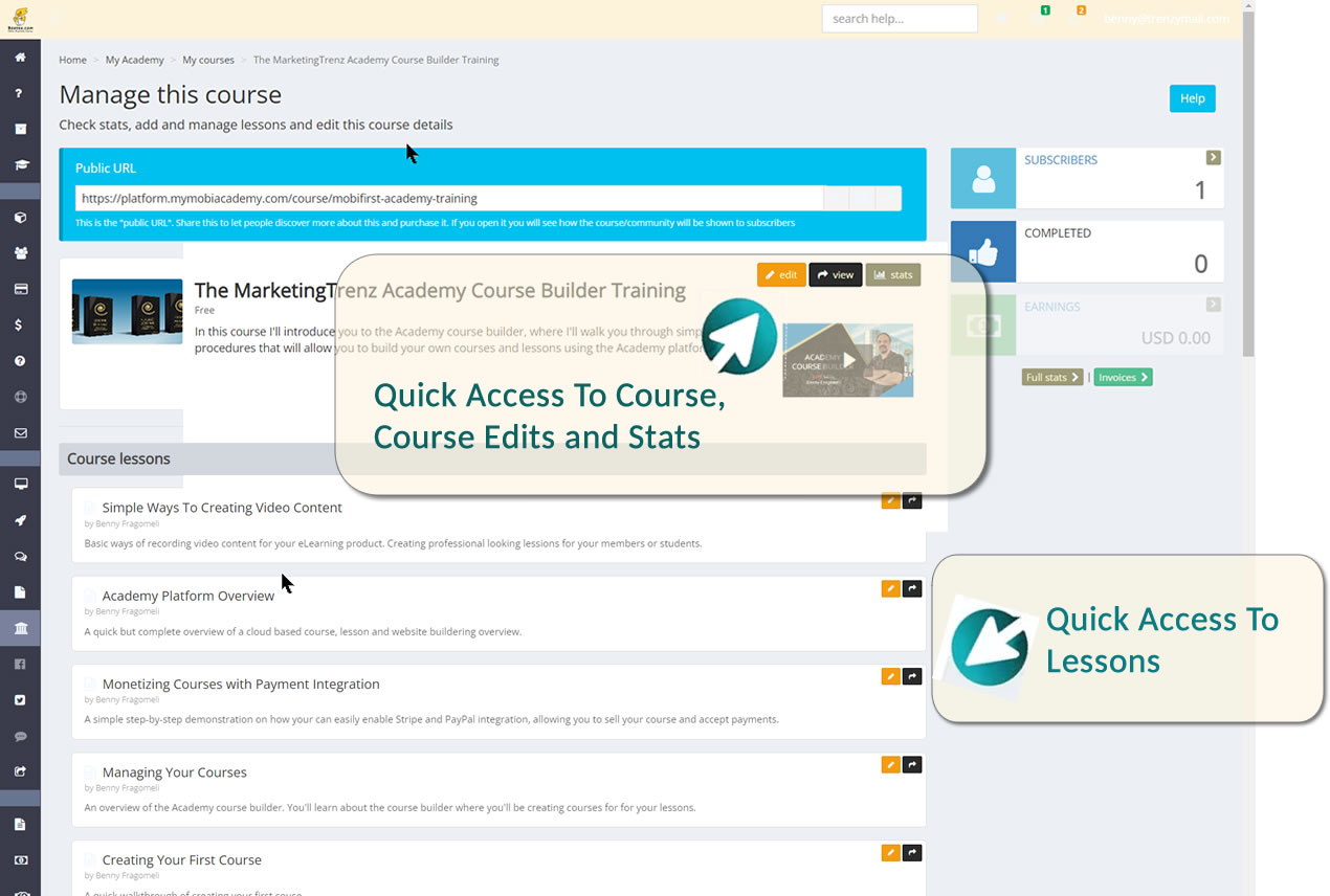 A clean and elegant dashboard. Create and edit courses and lessons fast.