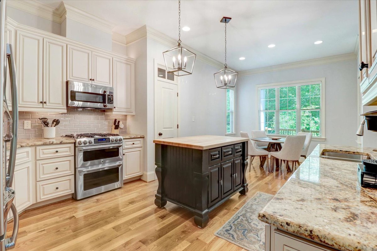 Inside, you'll be captivated by stunning living areas adorned with gleaming hardwood floors and charming transom windows. A focal point of the home is the elegant fireplace surrounded by custom built-ins and exquisite trim work. The gourmet kitchen is a chef's dream, featuring a furniture-style island, glass tile backsplash, granite countertops, and top-of-the-line stainless steel appliances.